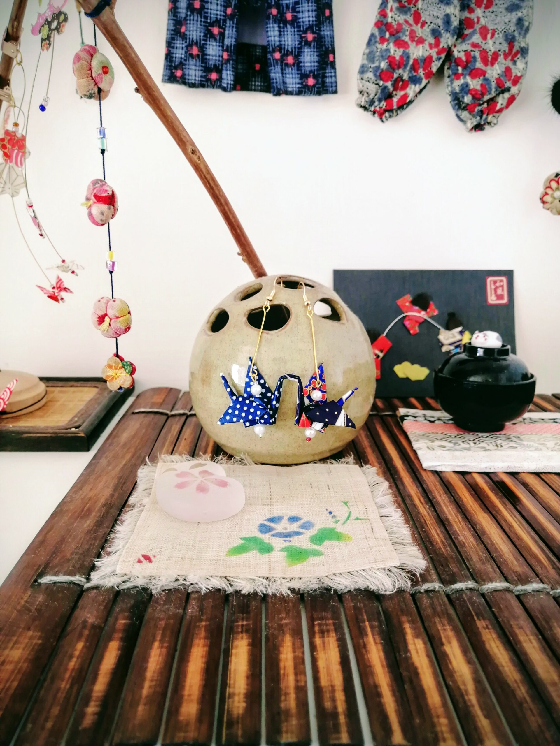 Japanese crane-shaped earrings crafted from blue and red-toned Washi Chiyogami paper. Each piece measures approximately 7.5 cm and is delicately adorned with matching beads.