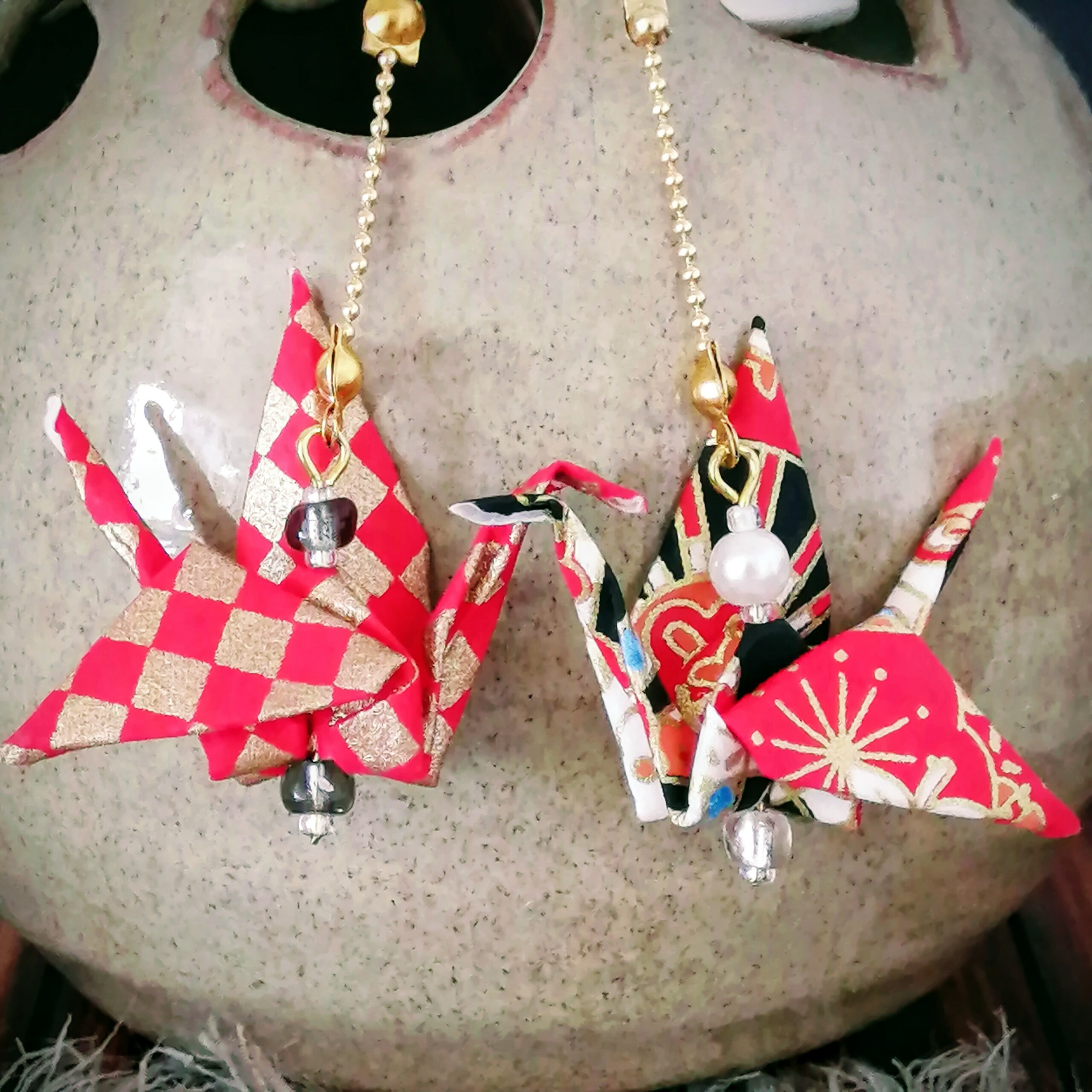 Tsuru Earrings – Origami Red & Black Crane in Yuzen Washi Paper