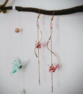 These tiny little Tsuru earrings celebrate the traditional Japanese art of origami. Each tiny crane is carefully folded from Yuzen Washi paper, renowned for its refined patterns and vibrant colors. These tiny Tsuru are adjustable according to your will.