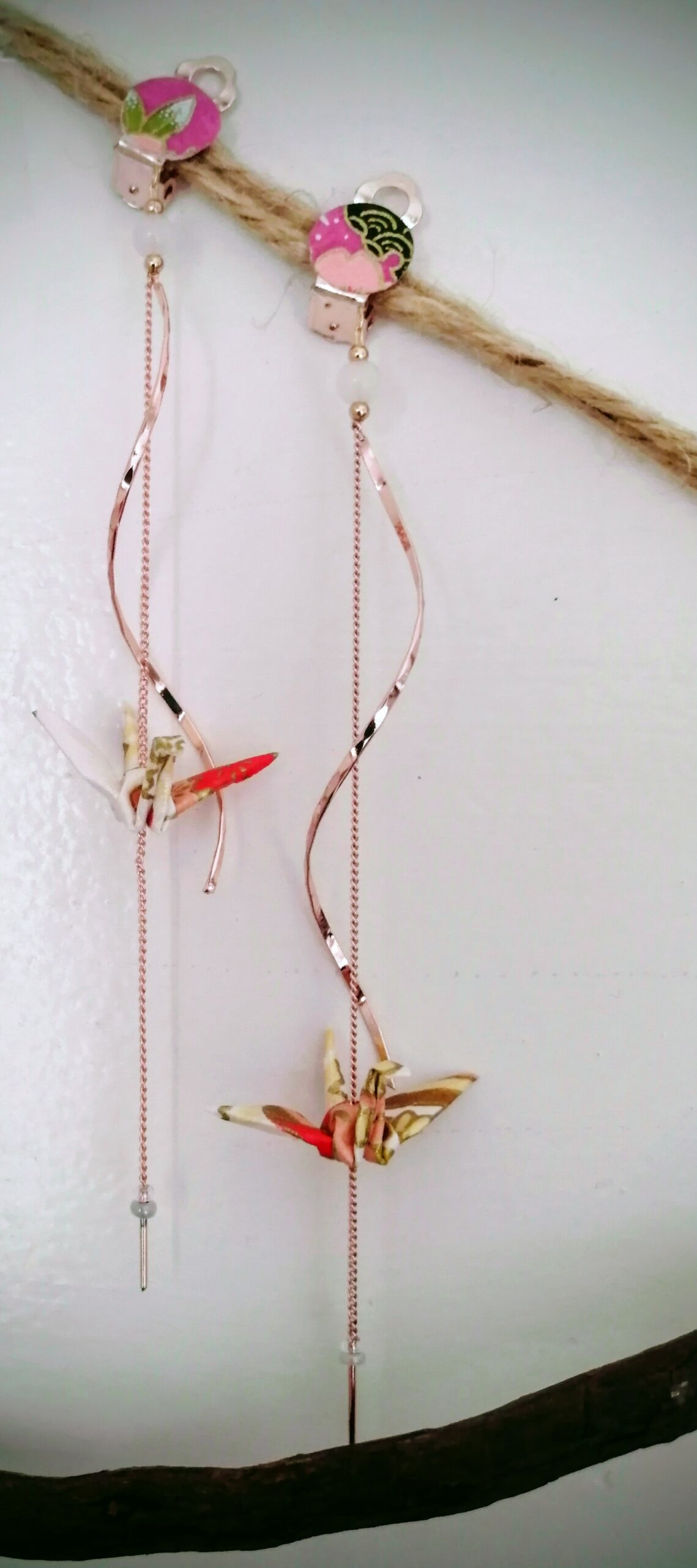 Materials: Yuzen Washi paper, decorative beads, gold-plated spiral chain and hooks (hypoallergenic)
