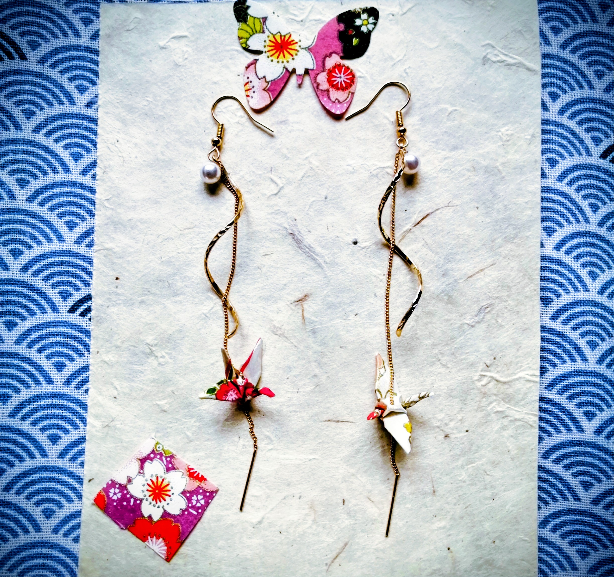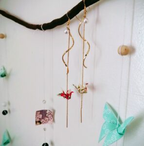 Elegant “Tsuru” earrings, handcrafted from Japanese Yuzen Washi paper, with decorative beads suspended from a fine spiral gold and chain.