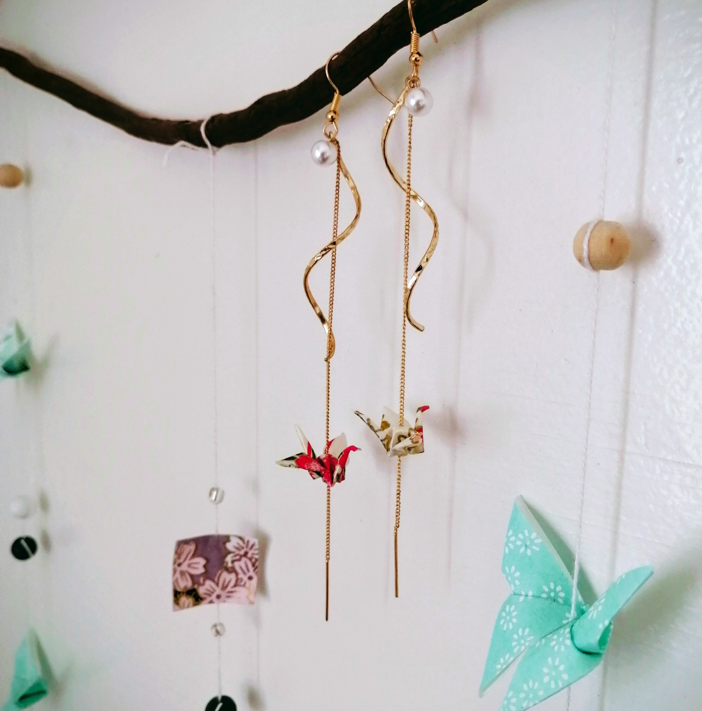 Materials: Yuzen Washi paper, decorative beads, gold-plated spiral chain and hooks (hypoallergenic)