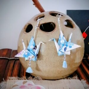 Tsuru Earrings Silver in Yuzen Washi paper – Blue Sky tone