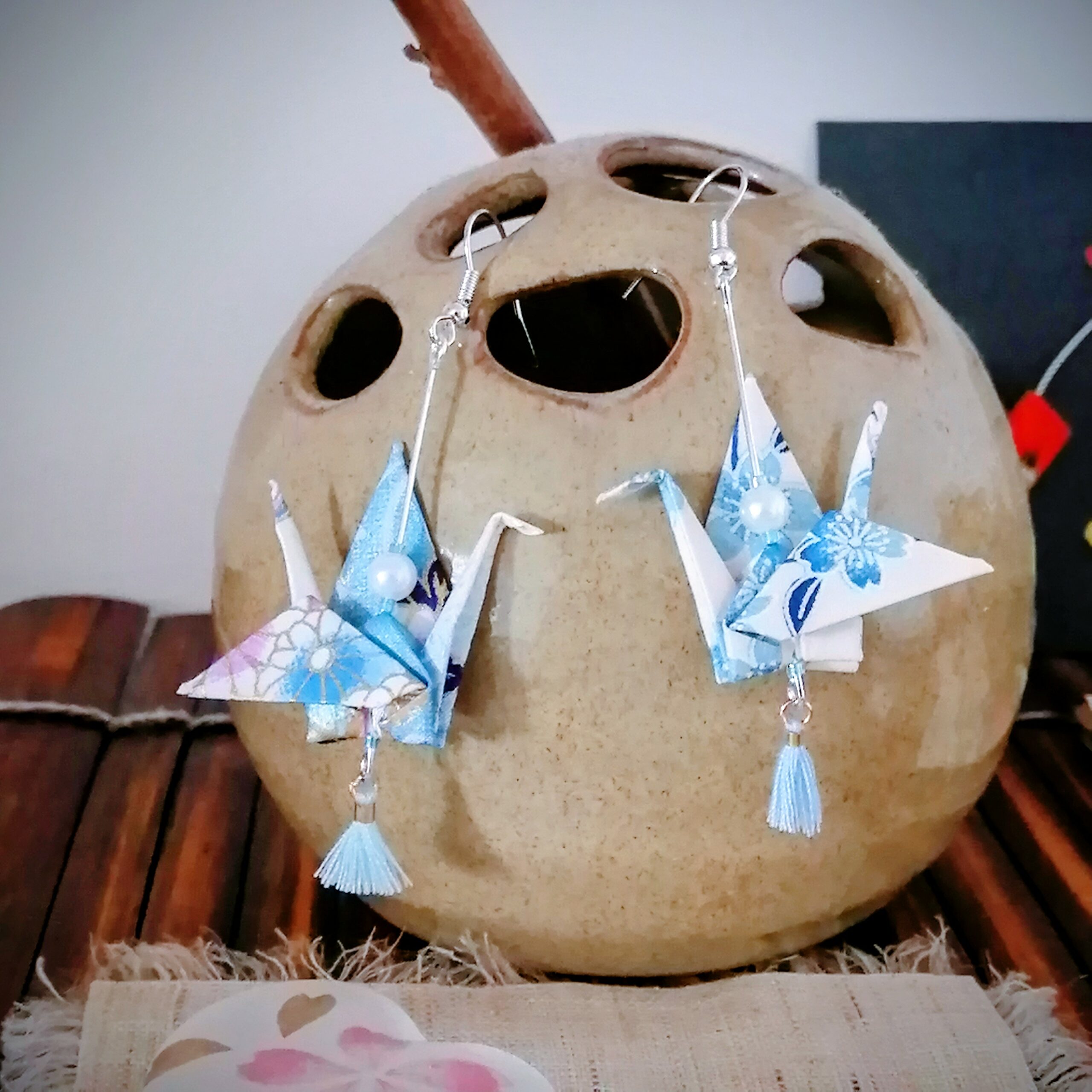 These “Tsuru” earrings celebrate the traditional Japanese art of origami. Each crane is carefully folded from Yuzen Washi paper, renowned for its refined patterns and vibrant colors.