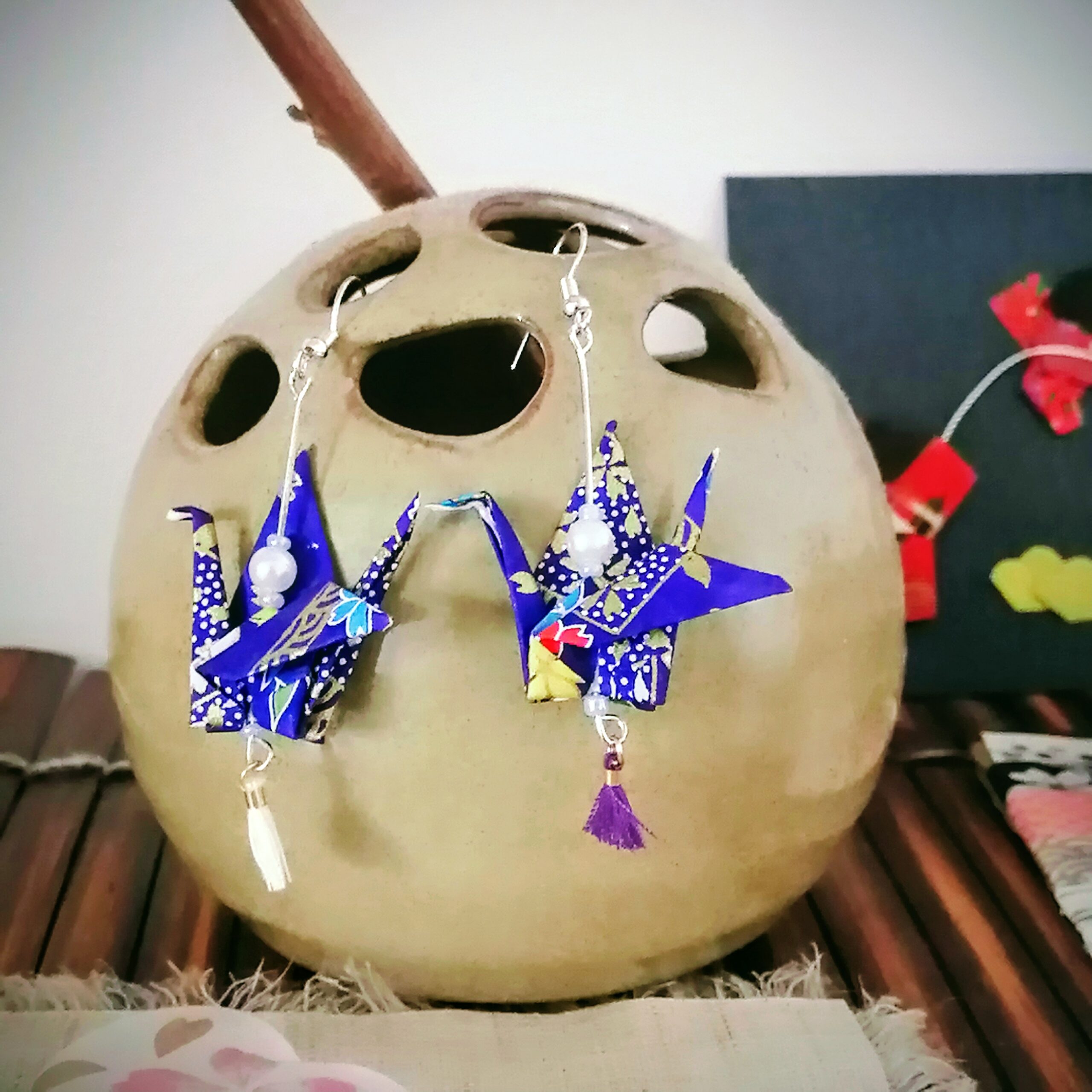 These “Tsuru” earrings celebrate the traditional Japanese art of origami. Each crane is carefully folded from Yuzen Washi paper, renowned for its refined patterns and vibrant colors.