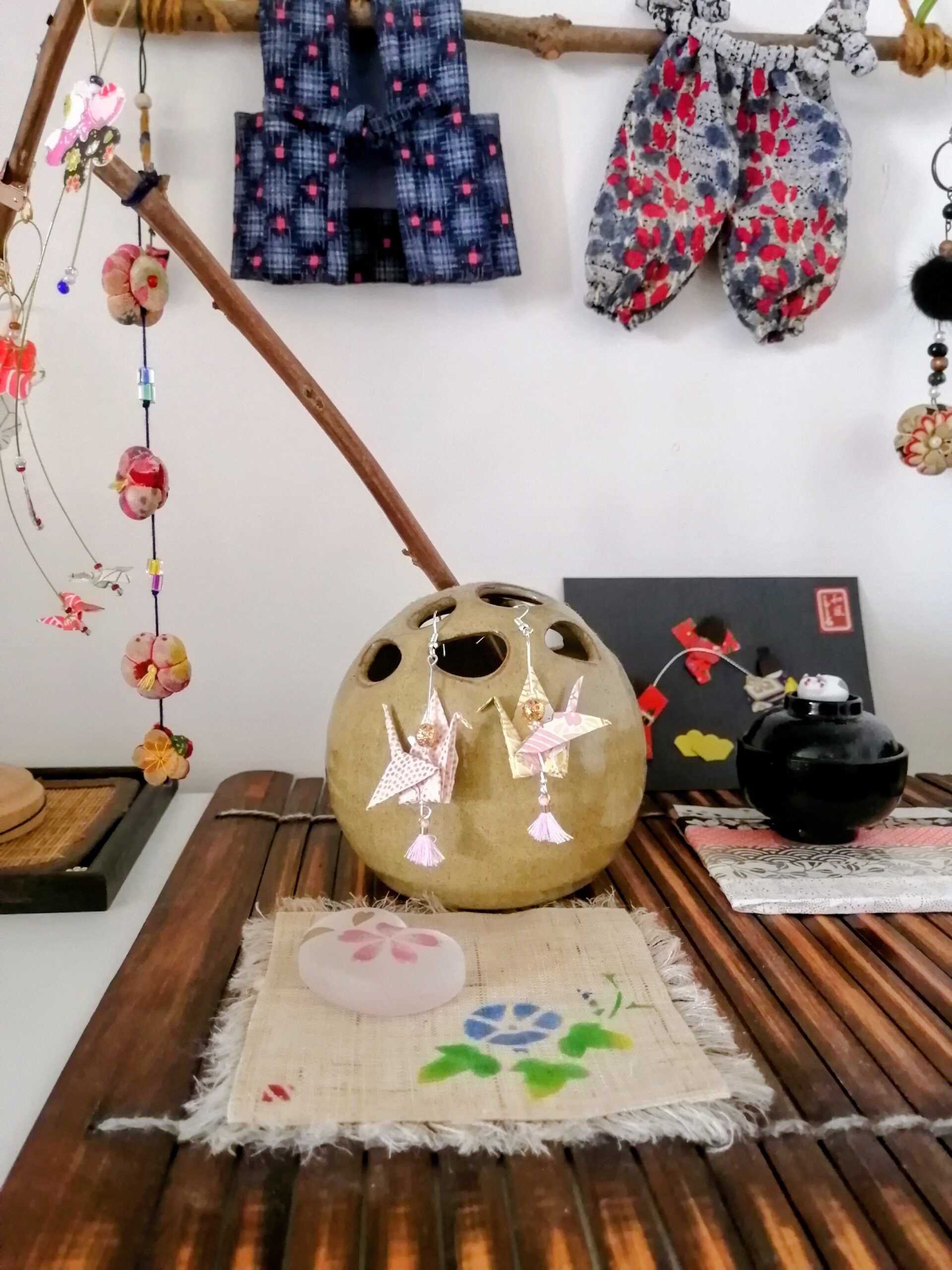 These “Tsuru” earrings celebrate the traditional Japanese art of origami. Each crane is carefully folded from Yuzen Washi paper, renowned for its refined patterns and vibrant colors.