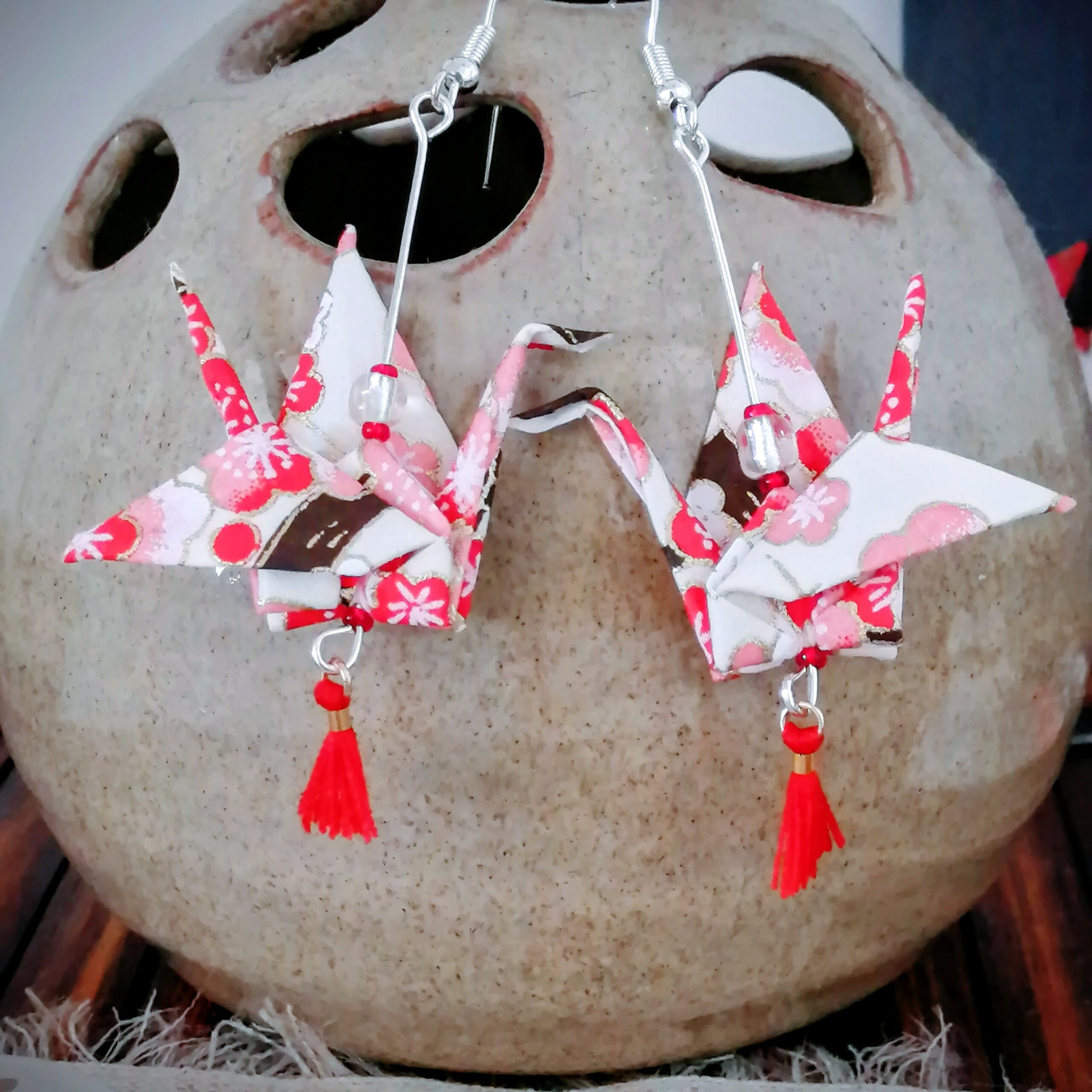Be the first to review “Tsuru Earrings Silver in Yuzen Washi paper – Red Flowers”