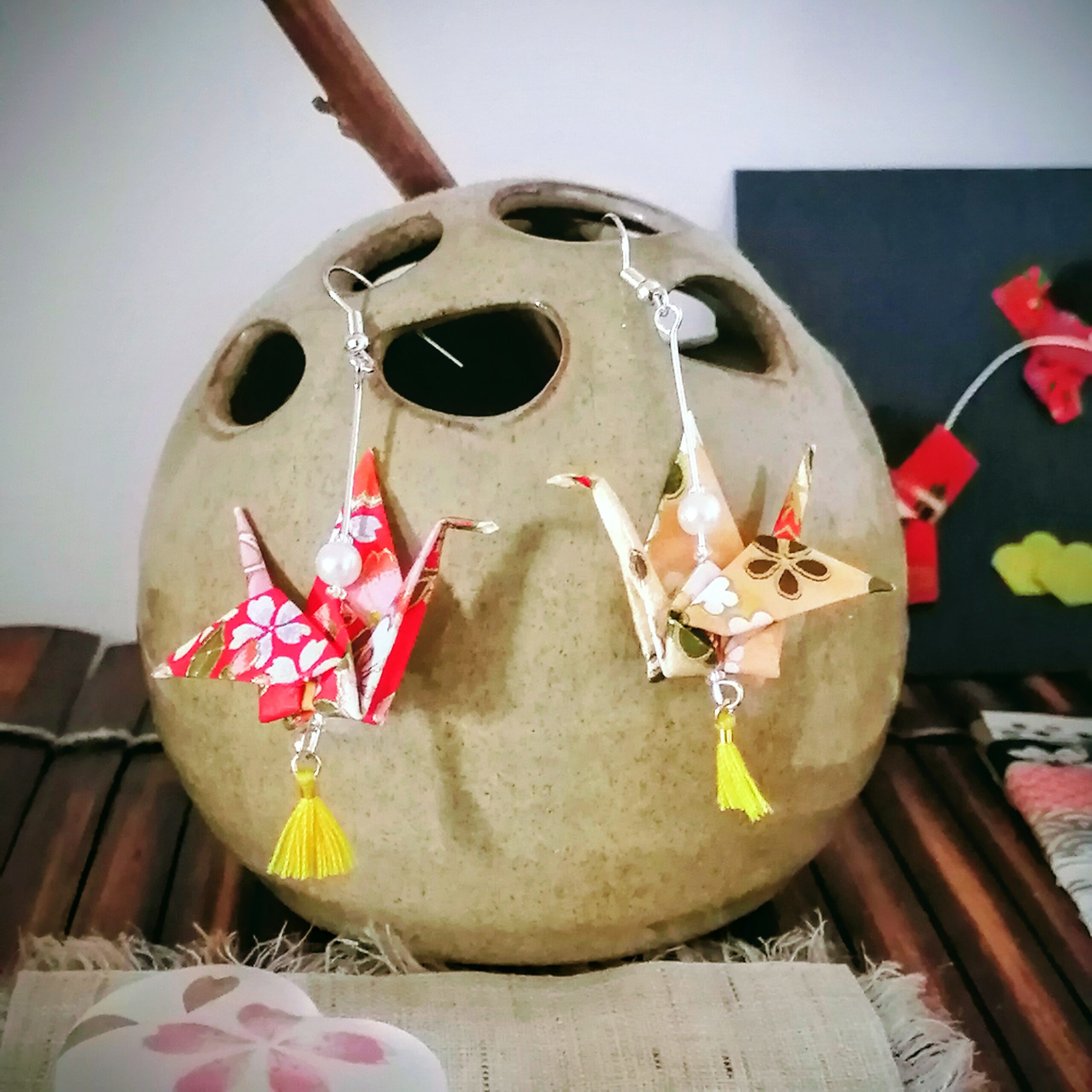 These “Tsuru” earrings celebrate the traditional Japanese art of origami. Each crane is carefully folded from Yuzen Washi paper, renowned for its refined patterns and vibrant colors.